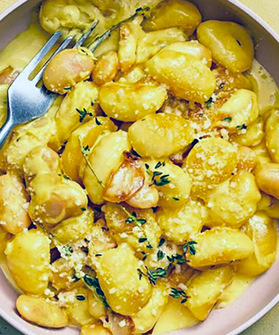 2. Sulata voi pannulla. Lisää valkosipuli ja timjamin oksat gnocchien kanssa pannulle. Paista kunnes gnocchit saavat väriä. Lisää valutetut pavut pannulle ja anna niiden kuumentua.