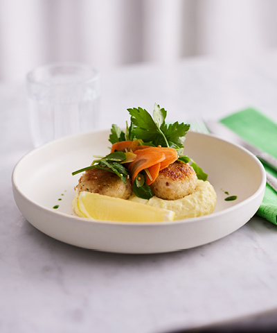 4. Viimeistele annos lehtipersiljalla ja halutessasi yrttiöljyllä. Tarjoa sitruunaviipaleen kera.