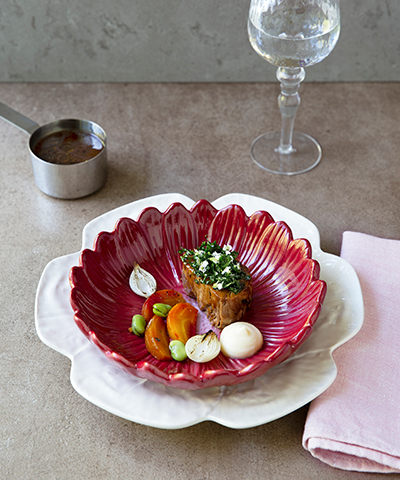 Karamelliglaseerattua ylikypsää possua, juuriselleripyrettä, keltajuurta ja punaviinikastike