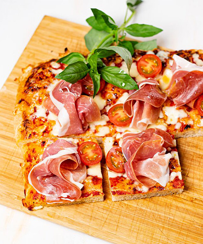Levitä tomaatikastike hyvin kohonneen pohjan päälle. Paista 220 C ° kiertoilmauunissa, puhallus 70 %, noin 15 minuuttia tai kun pohja on kypsä. Ripottele mozzarella päälle ja paista vielä pari minuuttia, niin että juusto sulaa. Leikkaa pohja paloiksi ja täytä palat ilmakuivatulla kinkulla, puolitetuilla kirsikkatomaateilla.